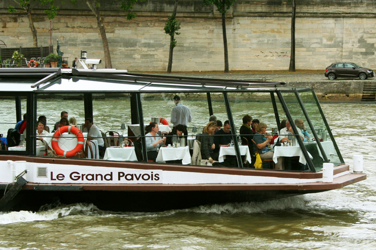 Notice the fine dining with white linen tablecloths on board