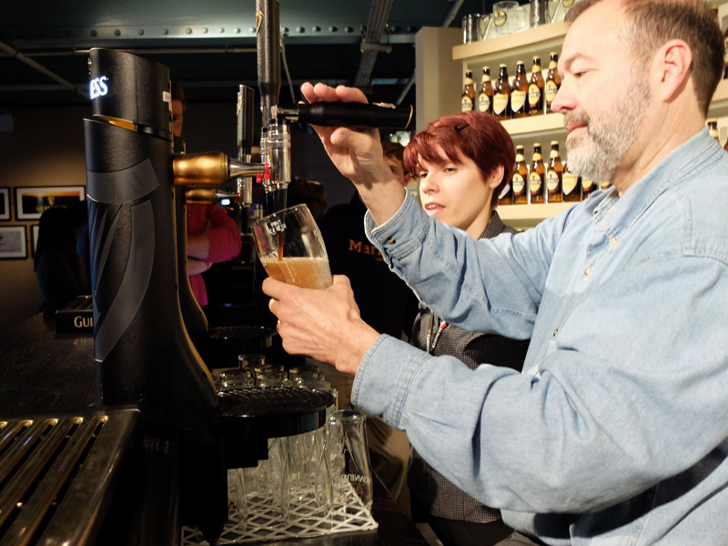 The tour is self-guided and includes a "free" pint of Guinness at the end. You work your way up from the first floor through exhibits on the making of the beer and the many advertising campaigns throughout Guinness' history to the sixth floor where you can learn how to pour the perfect pint or continue to the seventh floor where you can have your free pint poured and served by a bartender. The classroom on the sixth floor was almost empty and a very persistent Marta convinced Jeff he should wait a couple of minutes for a few more people and she would teach us how to pour a beer. Sure, why not.